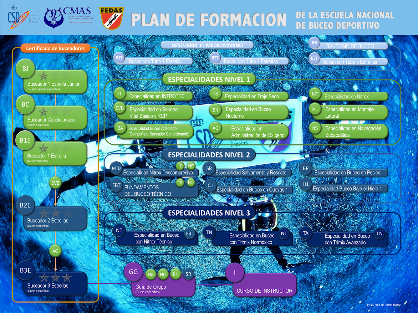 En colaboración con nuestros amigos de Buceo Profundo y del Gesc, ofrecemos una calidad de formación máxima. No queremos solo darte un carnet donde diga que eres buceador, queremos hacerte un buceador con todo lo que ello implica, sin prisas, seguros, tranquilos y por encima de todo disfrutando de la formación. Puedes decidir realizar los cursos por la Federación Española de Actividades Subacuáticas o por las certificadora Sdi/Tdi. Tu decides.